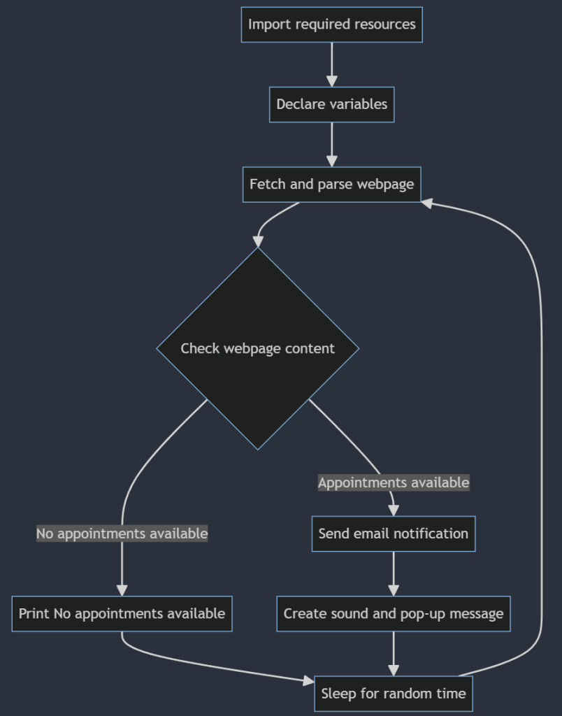 Next, I configured various parameters to control the script’s behaviour. This included a random sleep timer (to avoid being blocked by the website for looking like we’re trying to DDoS it with too many requests), the government page URL (so it knows where to find the slots), and the sound alert duration and frequency (to make sure we hear it!).