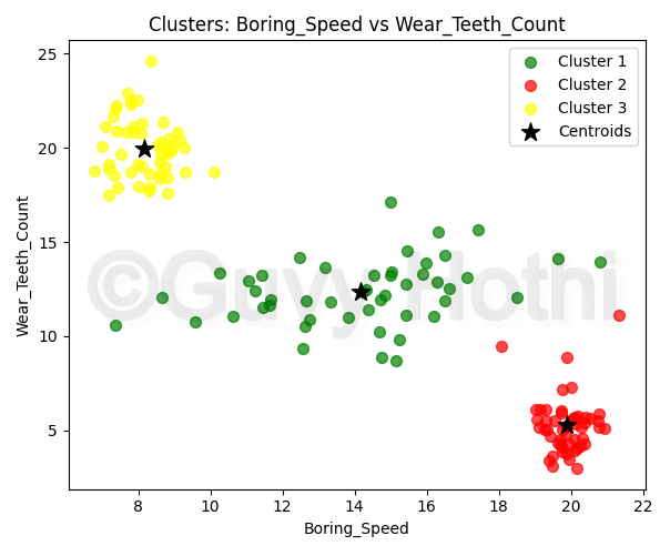 The most obvious observation is the contrast between the red cluster (high speed, low wear) and the yellow cluster (low speed, high wear). This warrants further investigation to determine what allows the red cluster TBMs to achieve higher speeds with less wear.