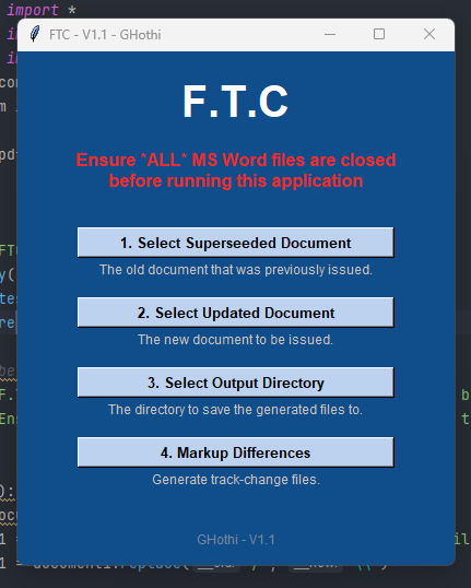 Label(text="Ensure *ALL* MS Word files are closed before running this application", bg="DodgerBlue4", fg="firebrick2", font="Arial 12 bold").pack(pady=(5,30))