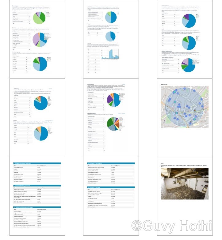 - Charts for the local area, including house types, tenure, occupancy, social grade, gender, age groups, relationship status, health status, education & qualifications, ethnicity, economic activity, employment industry, local crime map (the part we built in this post), nearest train station and schools etc.